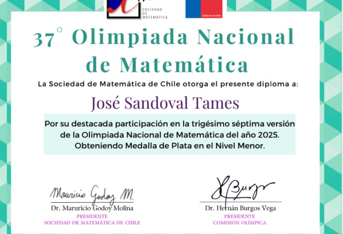 Una destacada participación en la Olimpíada Nacional de Matemática tuvo el alumno osé Carlos Sandoval, del 2° EM C, cuya final se realizó el 6, 7 y 8 de noviembre, logrando medalla de plata en la categoría menor de 16 años.