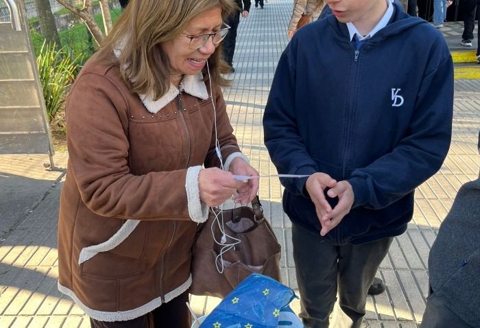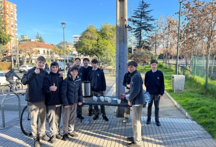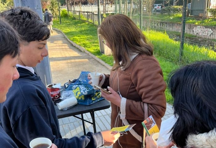 Acompañados por sus profesores jefes y adultos voluntarios del colegio, los alumnos invitaron a las personas que pasaban por el lugar a tener un buen día. Junto con el café, las personas recibieron una tarjeta elaborada por los niños de primer ciclo del colegio.