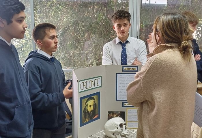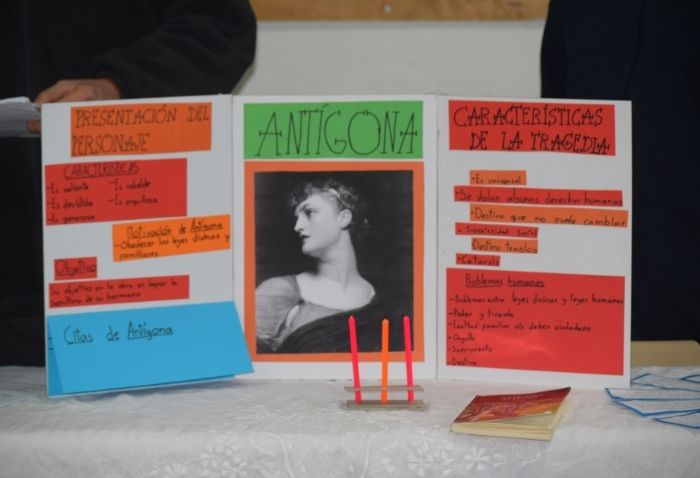 A través de una feria literaria realizada al terminar agosto, los alumnos de 1° EM mostraron todo lo aprendido en la asignatura de Lenguaje, con la lectura de la obra dramática Antígona, que se encuentra dentro del plan lector del nivel.