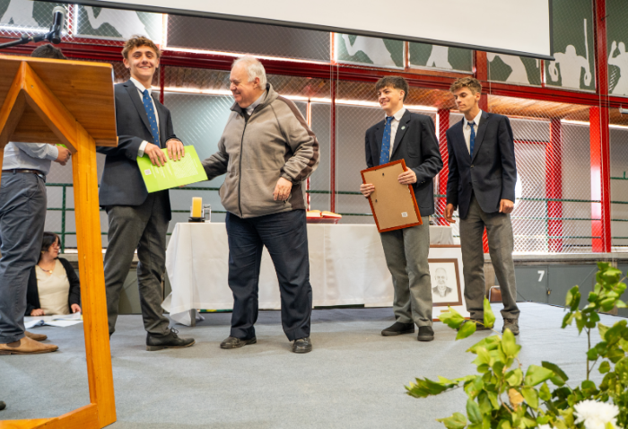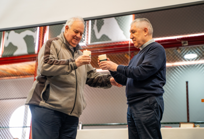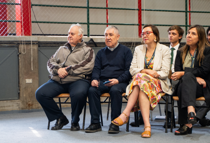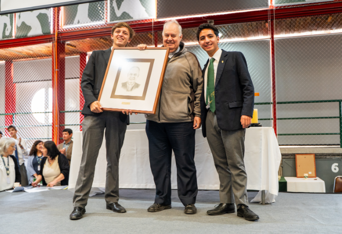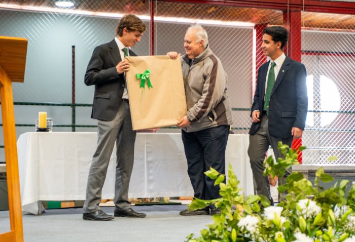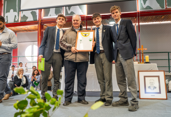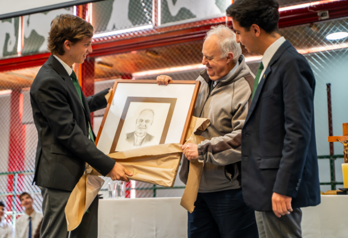 Una vez finalizada la eucaristía, los centros de alumnos 2025 y 2026 le regalaron al Padre Sergio un retrato y una polera y como comunidad recorrimos su historia y la del padre Miguel, que asumirá la rectoría en 2026.