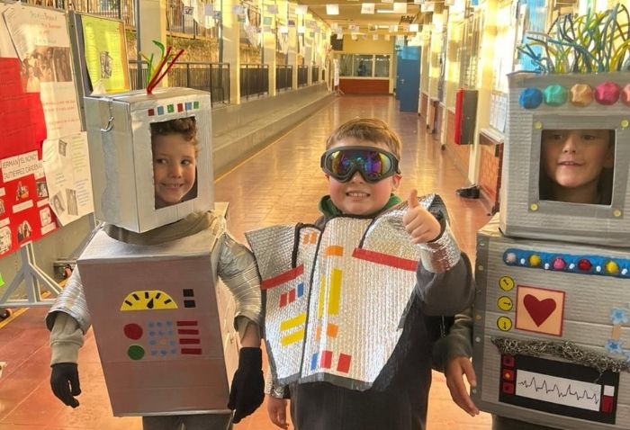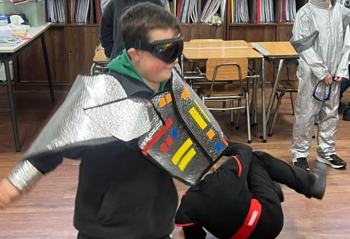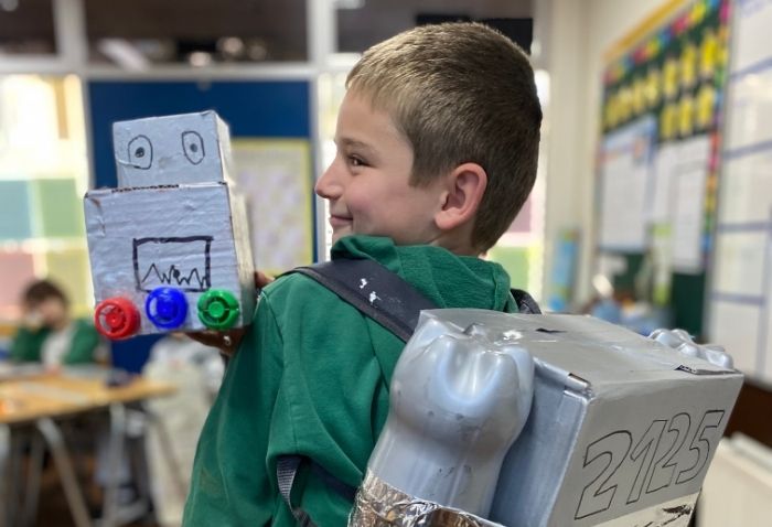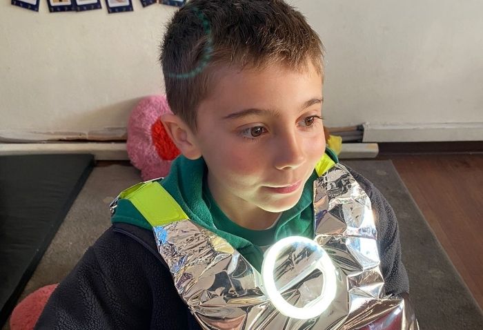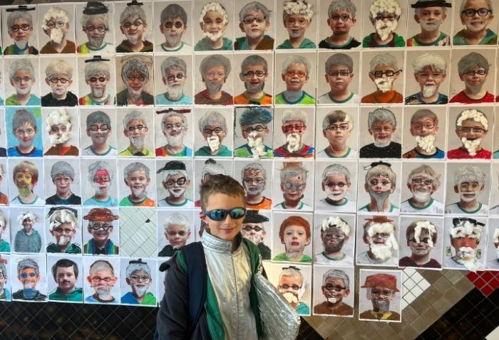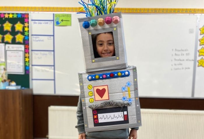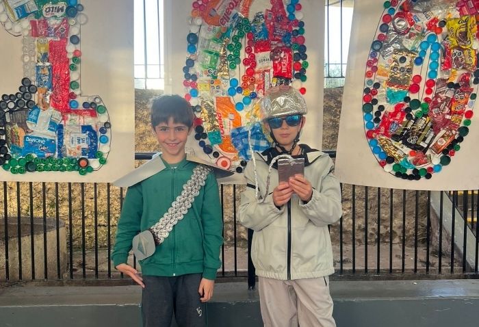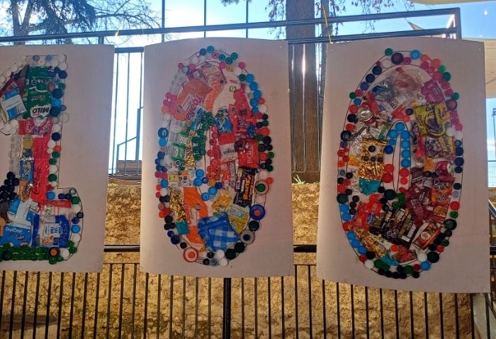 - Arte: los niños elaboraron su autorretrato donde se imaginaron cómo serían en 100 años más. Además, construyeron el número 100 con objetos de desecho.