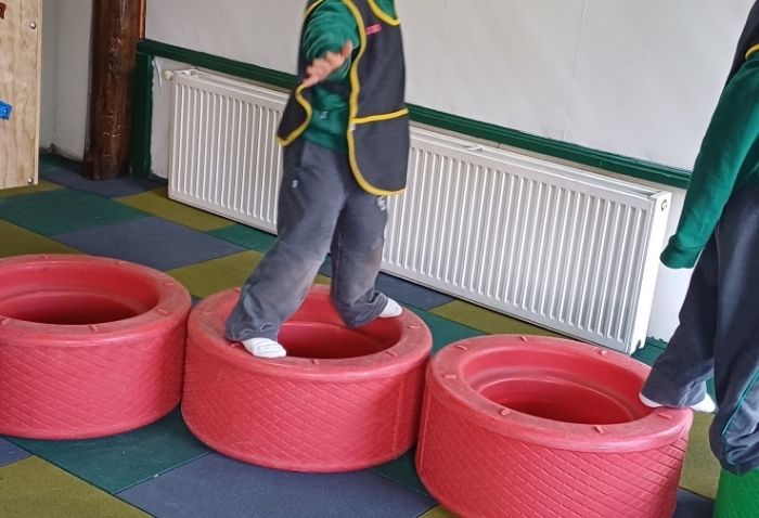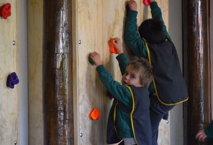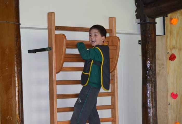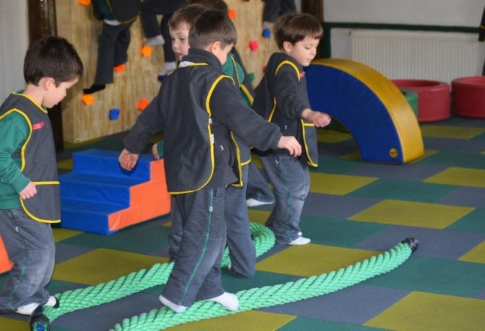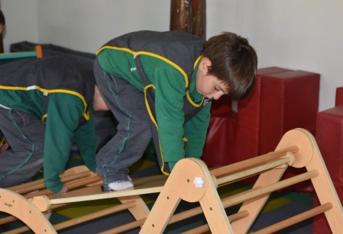 La sala cuenta con materiales blandos como colchonetas, bloques, pelotas y túneles, y se enriquece con equipamiento especializado: dos muros de escalada, espalderas y bases de equilibrio. Cada elemento busca estimular la coordinación, el equilibrio, la creatividad y la interacción social a través del juego y la exploración.