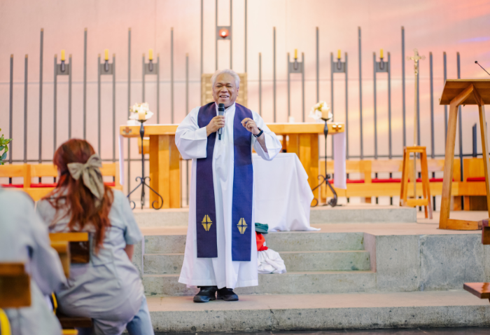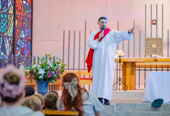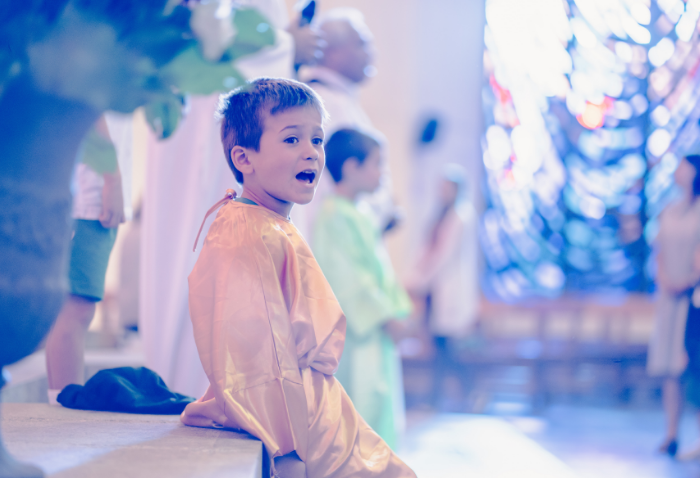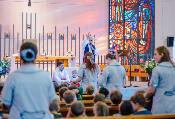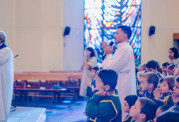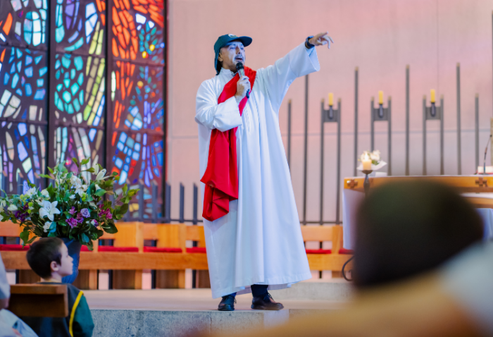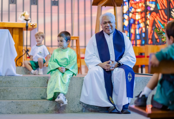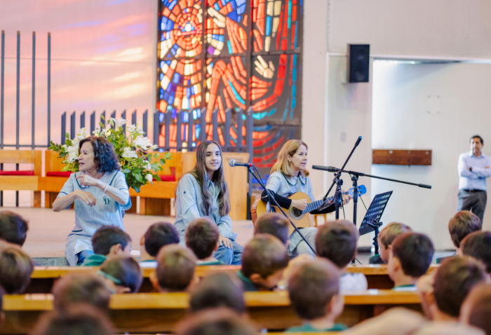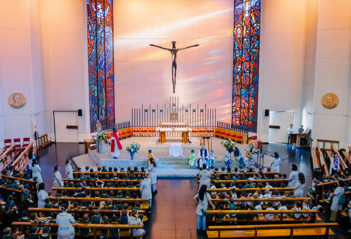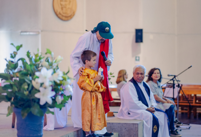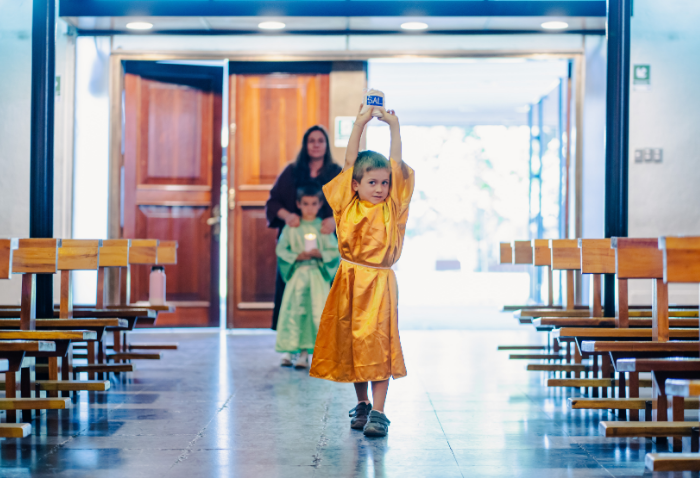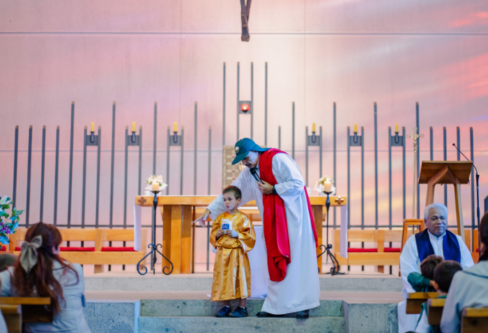 La liturgia, presidida por el padre Sebastián Go, svd, buscaba acercar la figura de Dios y de la Virgen a los niños, a través de animadas y alegres canciones y con la representación de Jesús a cargo de Pablo González, coordinador de Pastoral.