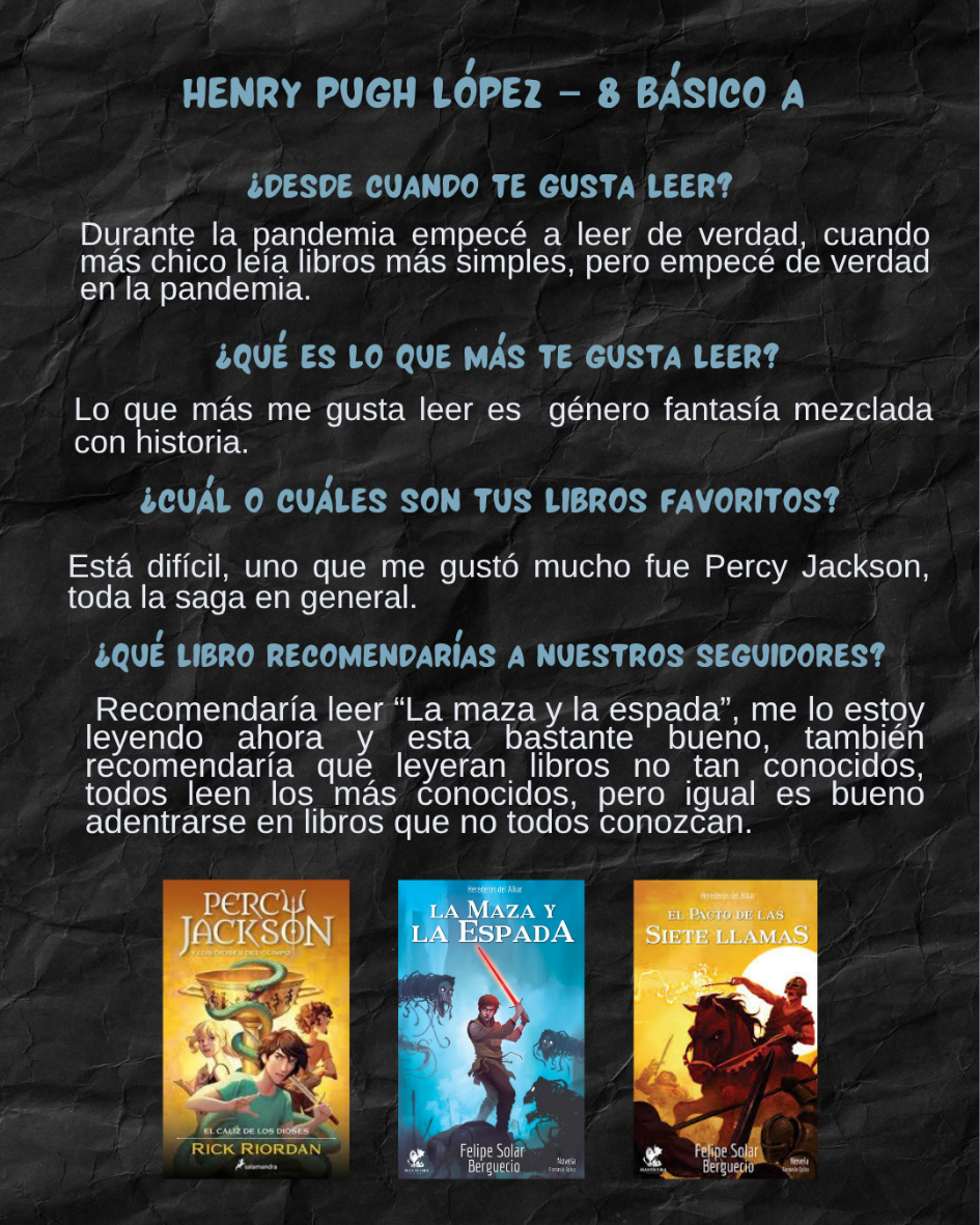 Como recomendación a sus compañeros, Henry los invita a leer “La maza y la espada”. “Me lo estoy leyendo ahora y está bastante bueno. También recomendaría que leyeran libros no tan conocidos, todos leen los más conocidos, pero igual es bueno adentrarse en libros que no todos conozcan”, finaliza.