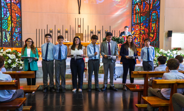 Alumnos de 7°EB reciben banderín de generación en misa del peregrino