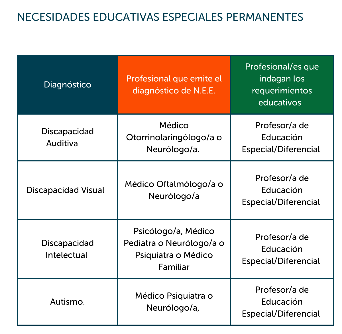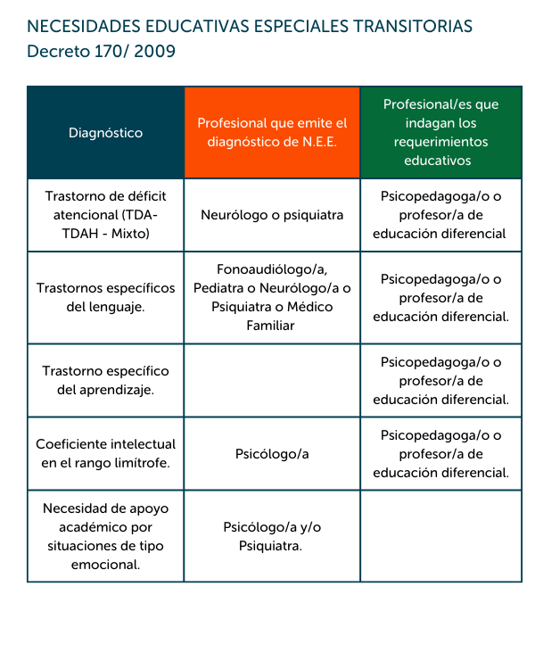 De acuerdo con el Decreto N.° 170/2009 del Ministerio de Educación, el colegio debe resguardar que los diagnósticos y requerimientos educativos sean emitidos por profesionales idóneos, según cada necesidad educativa especial. Por esta razón, sólo se considerarán informes emitidos por los especialistas indicados en la siguiente tabla.