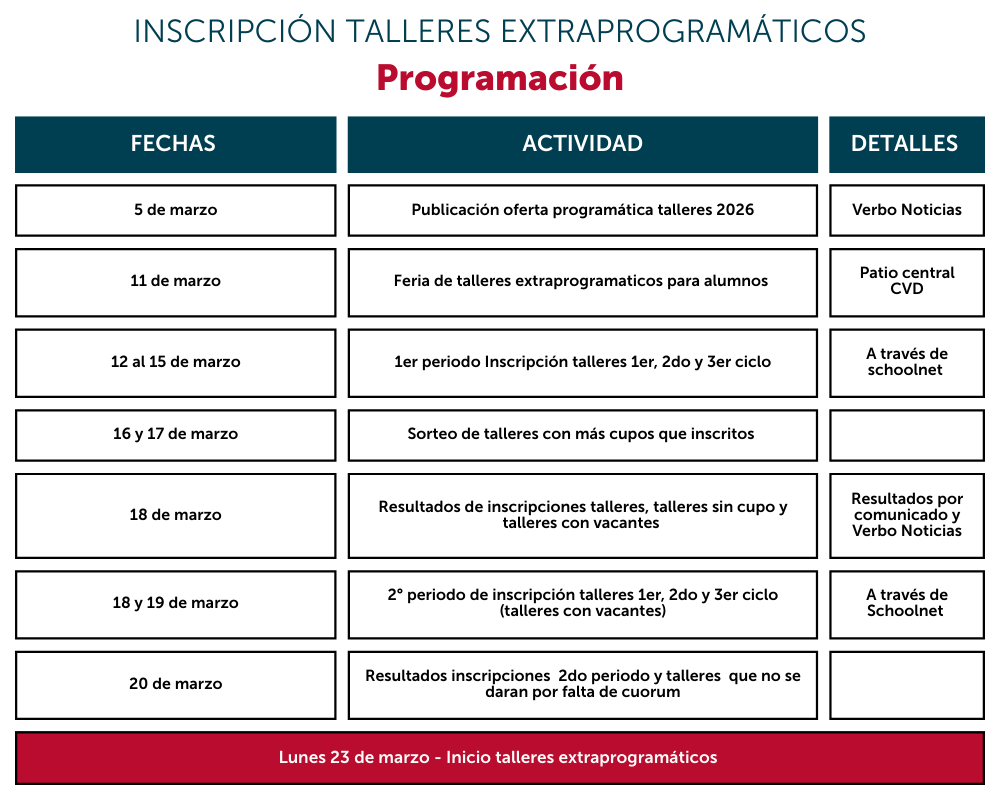 Queremos invitarlos a participar en el proceso de inscripción a los talleres extraprogramáticos que este 2026 se ofrecerán para los estudiantes del Verbo Divino.